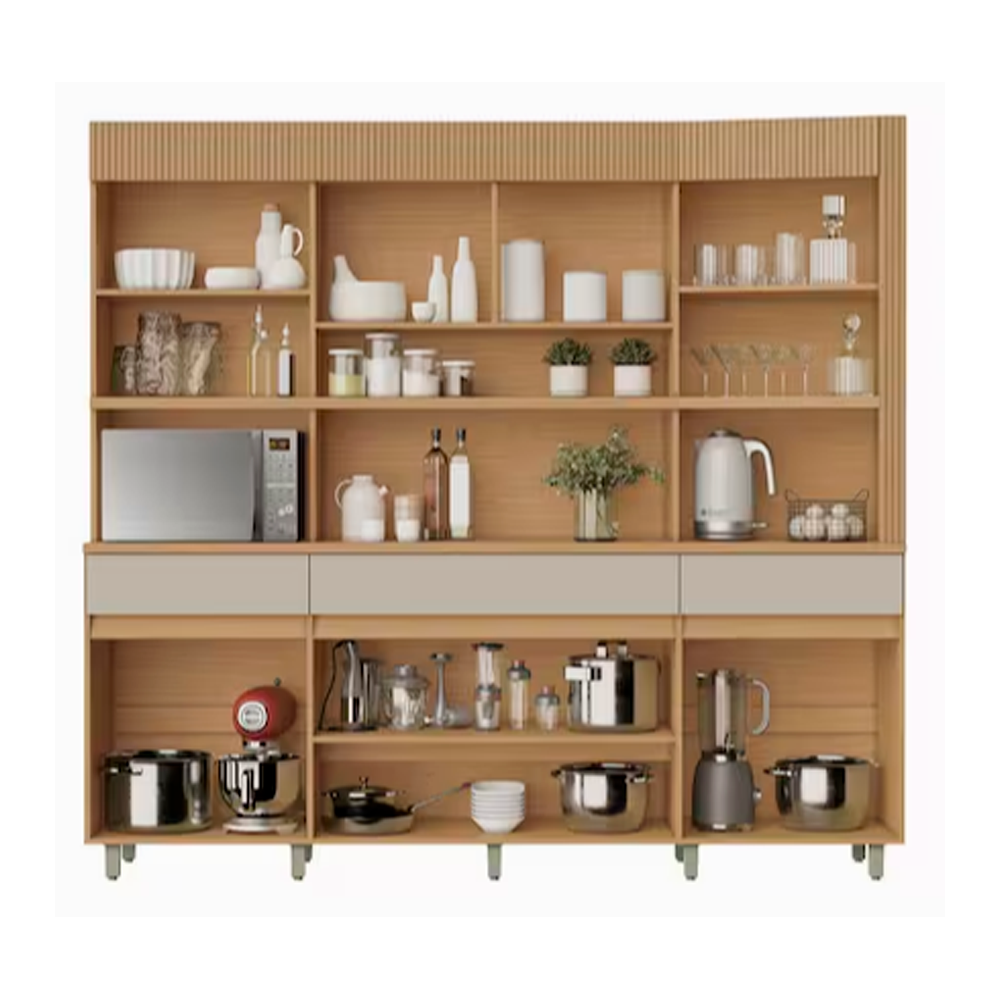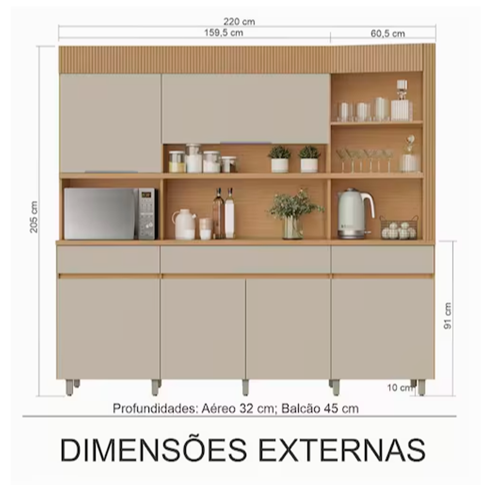 Armário de Cozinha 6 Portas 3 Gavetas 220cm 100% Mdf Realeza Nesher Móveis Carvalho Greige